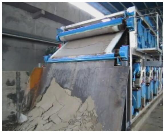 4、出泥濃度高達40-52%,出泥比板框式污泥壓濾機高10個百分點以上。而且含水率均衡,接收單位隨意抽檢污泥,其測得含水率數值是幾乎相同的。這一點是板框壓濾機做不到的。(因為板框壓濾機的進泥是靠高壓泵加壓完成的,進泥通道和中間污泥含水率高,靠濾布兩面含水率低,俗稱為夾心餅干式結構)。
